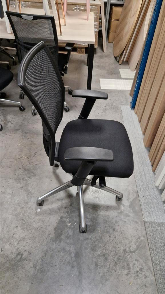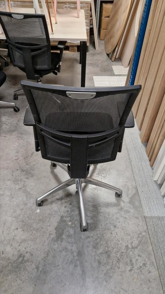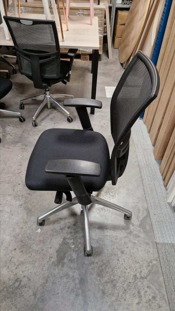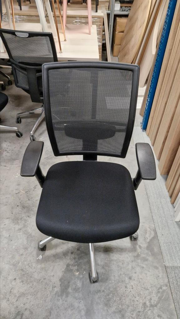 Gebruikte bureaustoel met een zwarte mesh rugleuning voor goede ventilatie. De stoel is ergonomisch verstelbaar en daardoor comfortabel voor dagelijks gebruik.