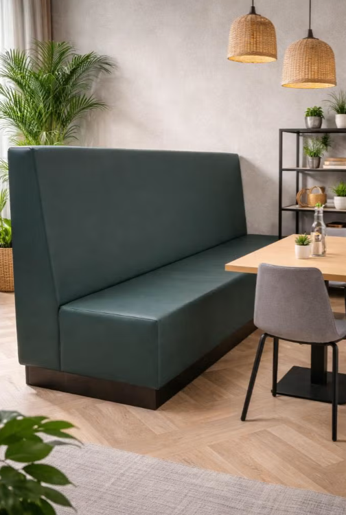 Deze stijlvolle treinbank van Bravour (240 cm breed) is een echte blikvanger voor iedere ruimte. De bank is uitgevoerd in een diepe donkergroene kleur, wat zorgt voor een warme en luxe uitstraling. Dankzij de zwarte houten rand rondom de onderzijde krijgt het meubel een robuuste en hoogwaardige afwerking die perfect past binnen zowel moderne als industriële interieurs.