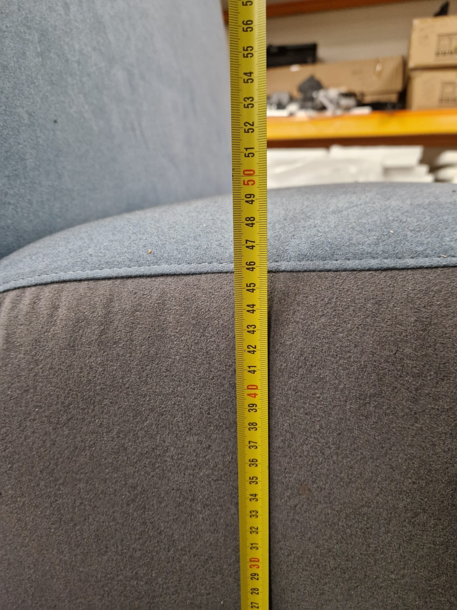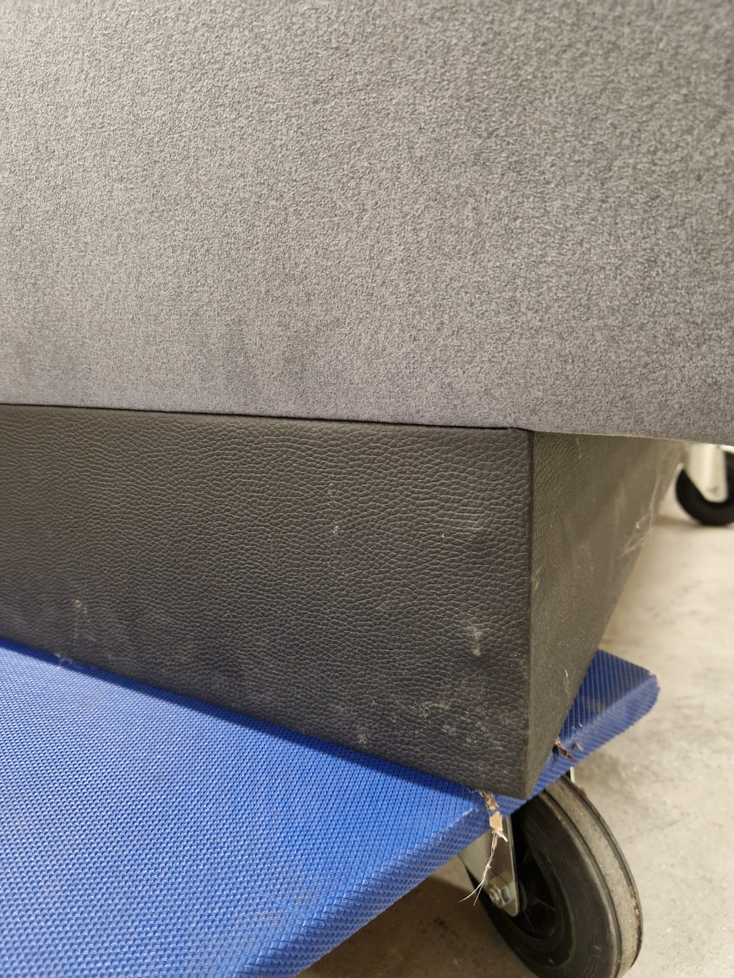 Treinbank uitgevoerd in een blauw / grijze kleur, met aan de onderzijde een zwarte houten afwerking (poot). De combinatie zorgt voor een moderne en stevige uitstraling.