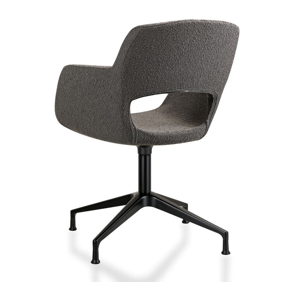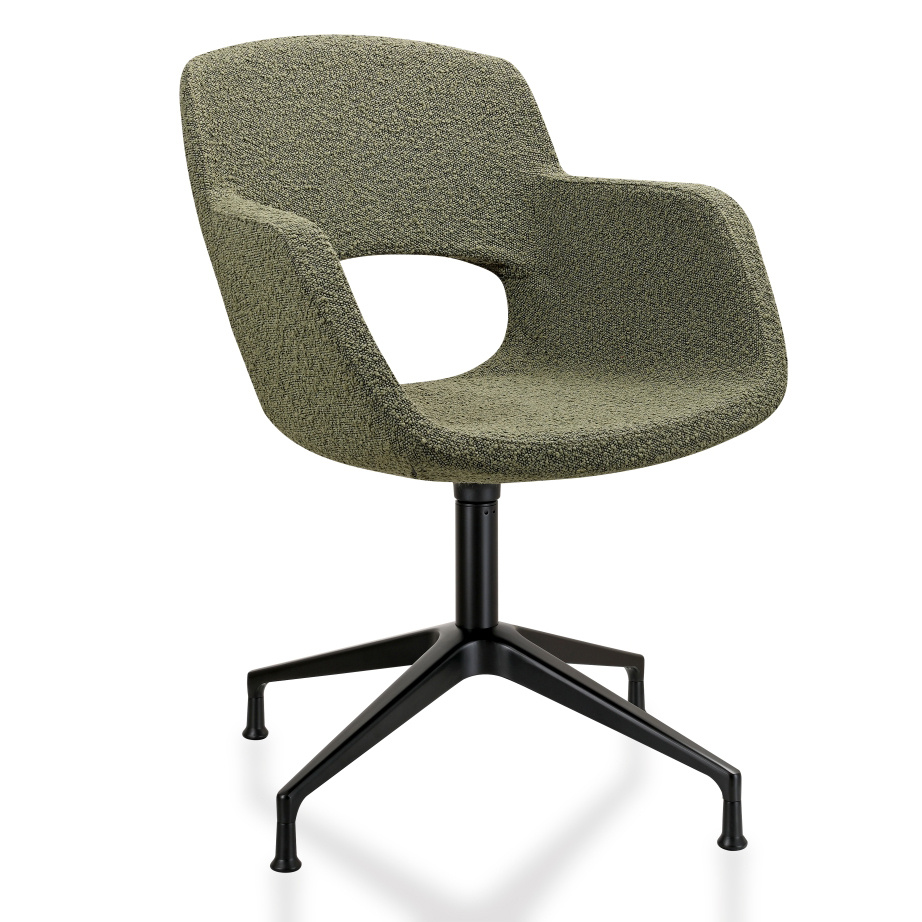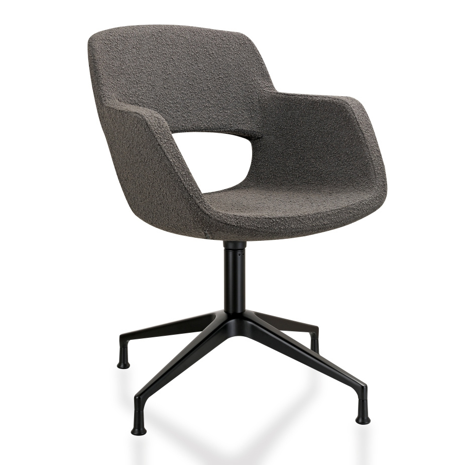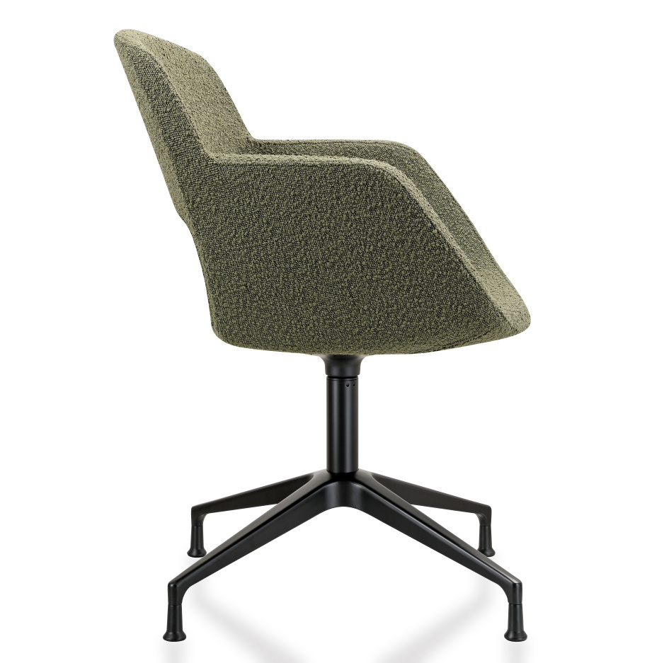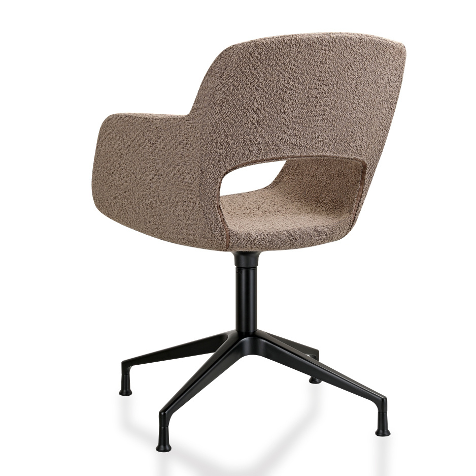De trendy vergaderstoel is een stijlvolle en comfortabele toevoeging aan elke ruimte. De zachte bouclé stoffering geeft de stoel een warme en luxe uitstraling. Het zwarte aluminium frame zorgt voor een strakke en moderne look. Verkrijgbaar in vier kleuren.