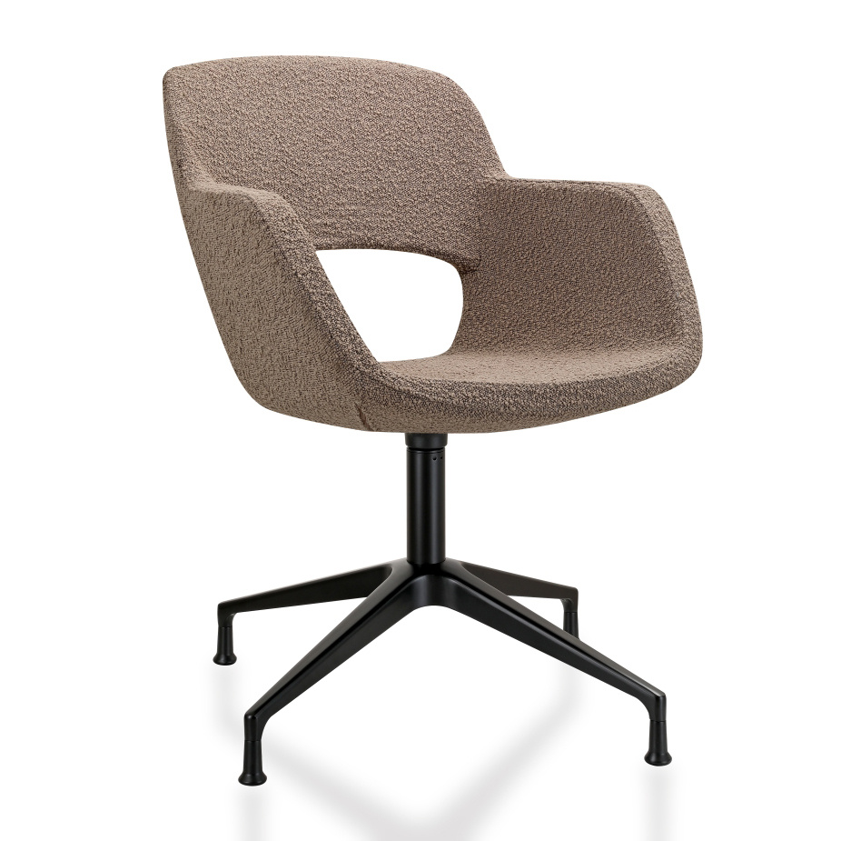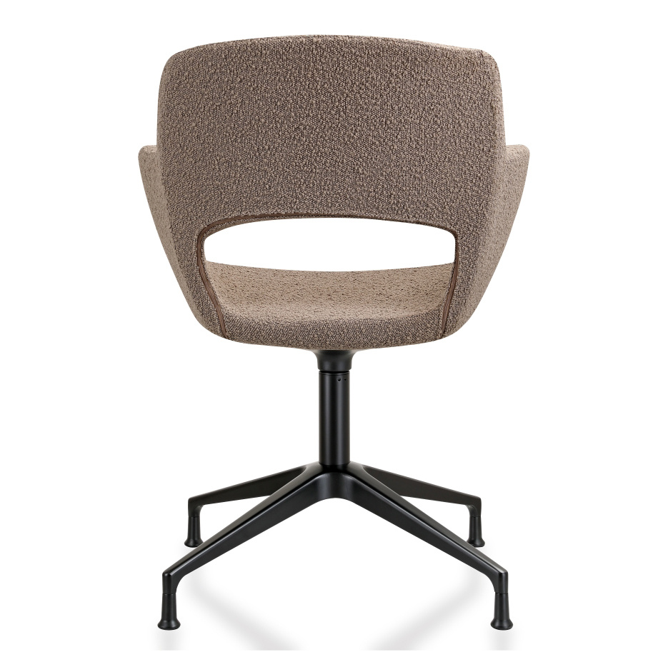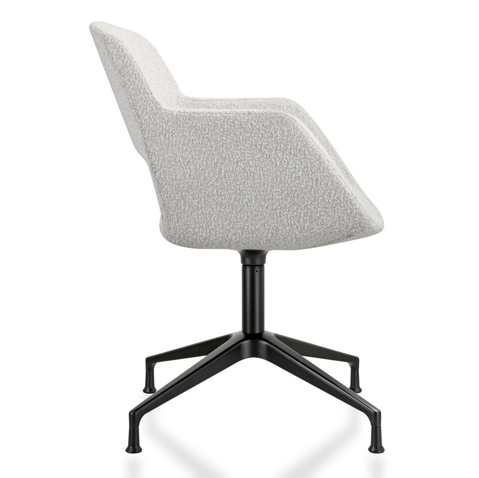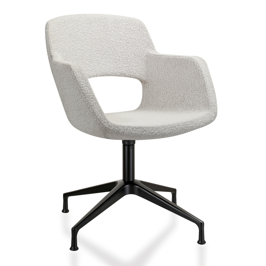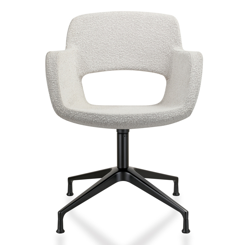 De trendy vergaderstoel valt op door zijn zachte bouclé teddy stoffering die niet alleen uitnodigend oogt, maar ook heerlijk zit. De slijtvastheid van 50.000 Martindale garandeert dat de stof lang mooi blijft, zelfs bij intensief gebruik. Zo combineer je comfort met duurzaamheid.